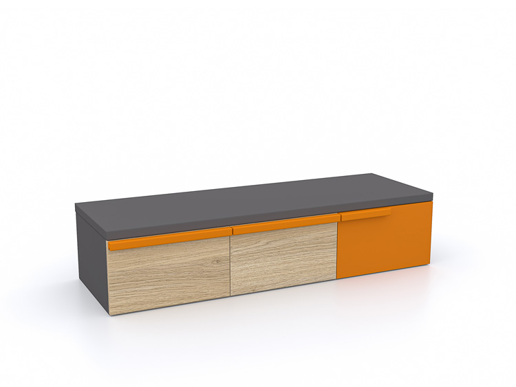 Kontener z szufladami. Doskonale uzupełnia się z regałami z kolekcji o szerokości 100 cm i 50 cm lub np. trzema regałami o szerokości 50 cm stanowiąc lekką, ażurową zabudowę. Jako samodzielny mebel sprawdza się np. jako skrzynia na zabawki lub do przechowywania pościeli. W tej bryle dwa fronty zawsze występują w okleinie drewnianej, a trzeci oraz uchwyty w jednym z pięciu pastelowych kolorów kolekcji.