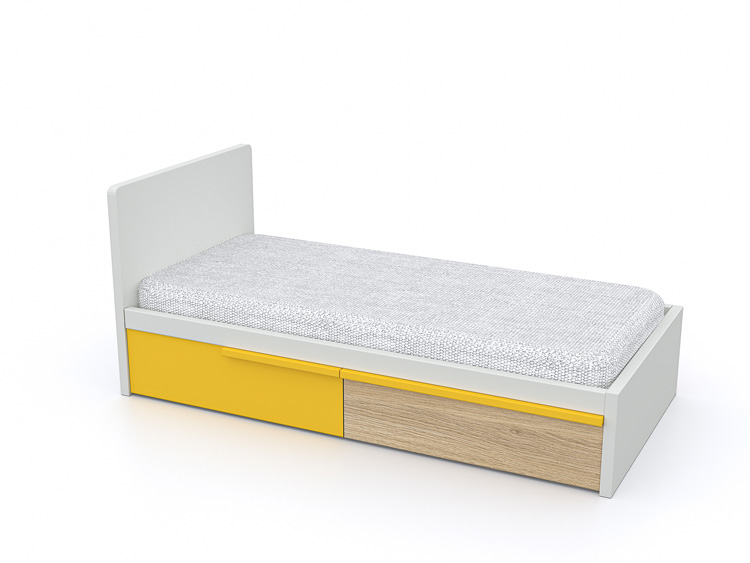 Proste i ergonomiczne łóżko o wymiarach 208x98 cm (pod materac 200x90 cm). Wysokość zanóża wynosi 37 cm, a zagłówka 85 cm, co pozwala na wygodne oparcie. Krawędzie zagłówka są delikatnie zaokrąglone. W konstrukcji łóżka zastosowano płytę o grubości 3,6 cm dzięki czemu jest ono solidne, bardzo wytrzymałe i eleganckie w formie. Łóżko ma także dwie głębokie szuflady, w których swobodnie można przechowywać pościel czy poduszki i koce. Zmieszczą się w nich także pluszowe zabawki czy komplety klocków.