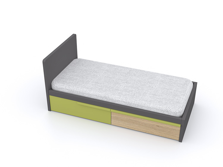 Proste i ergonomiczne łóżko o wymiarach 208x98 cm (pod materac 200x90 cm). Wysokość zanóża wynosi 37 cm, a zagłówka 85 cm, co pozwala na wygodne oparcie. Krawędzie zagłówka są delikatnie zaokrąglone. W konstrukcji łóżka zastosowano płytę o grubości 3,6 cm dzięki czemu jest ono solidne, bardzo wytrzymałe i eleganckie w formie. Łóżko ma także dwie głębokie szuflady, w których swobodnie można przechowywać pościel czy poduszki i koce. Zmieszczą się w nich także pluszowe zabawki czy komplety klocków.